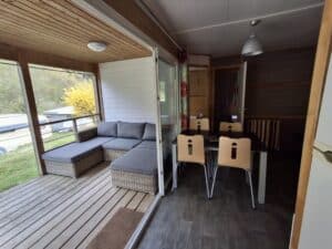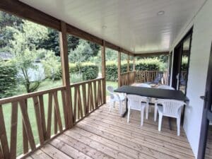 Grande terrasse couverte avec mobilier de jardin ainsi qu’un espace gazoné est accessible devant chacun de nos chalets conforts.