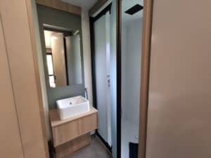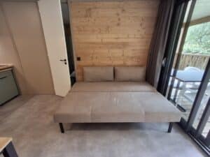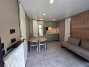 Cuisine équipée et moderne : plaques à induction, lave-vaisselle et four à micro-onde – Salon avec un canapé lit